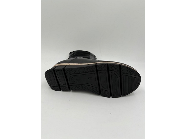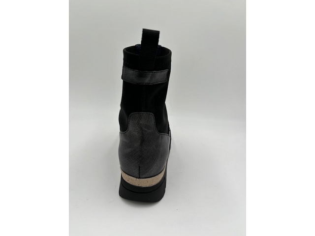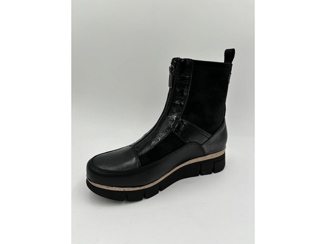 Bottines. Dessus cuir, cuir vernis et nubuck. Doublure textile. Première textile. Fermeture éclaire sur le coup de pied. Semelle élastomère. Se cire pour le cuir. S'entretient avec un chifon humide. Se lave et se fait sécher à l'ombre pour le nubuck.