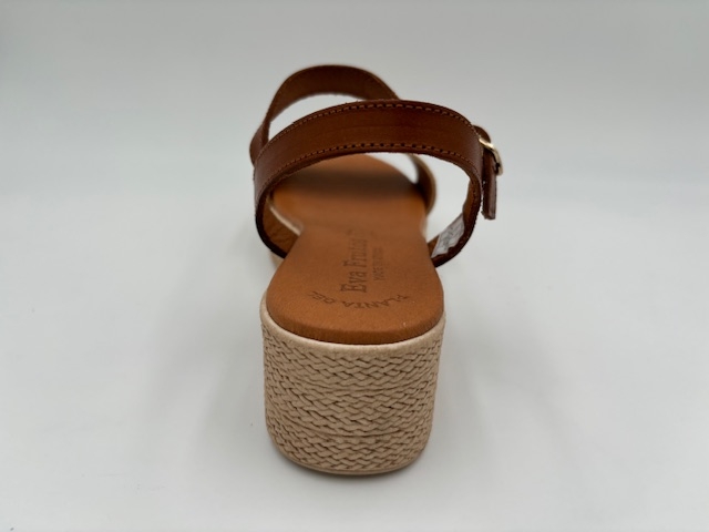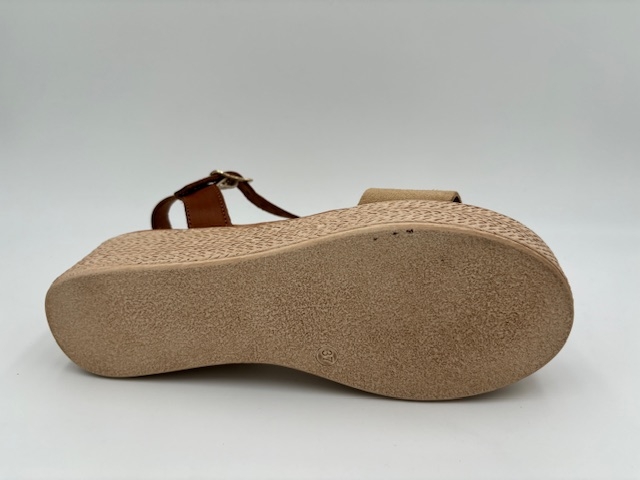 Compensé. Dessus cuir et nubuck. Doublure synthétique. Première cuir. Fermeture avec boucle sur le côté. Semelle élastomère. Se cire pour le cuir. Se lave et se fait sécher à l'ombre pour le nubuck.
