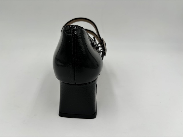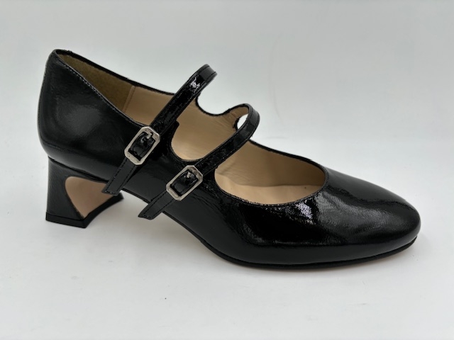Talon. Dessus cuir vernis. Doublure cuir. Première cuir. Fermeture avec boucles sur le coup de pied. Semelle élastomère.; S'entretient avec un chiffon humide.