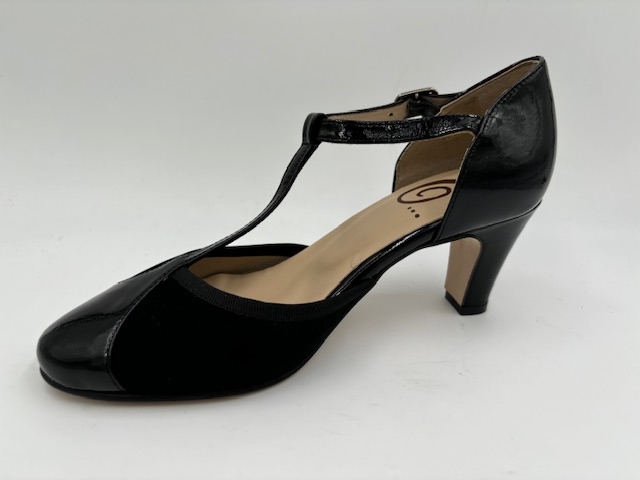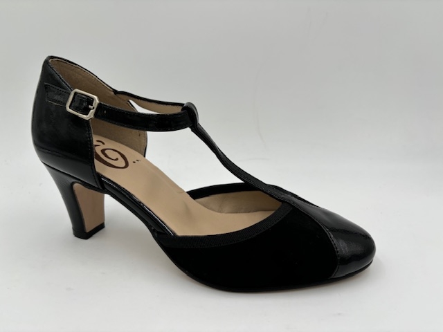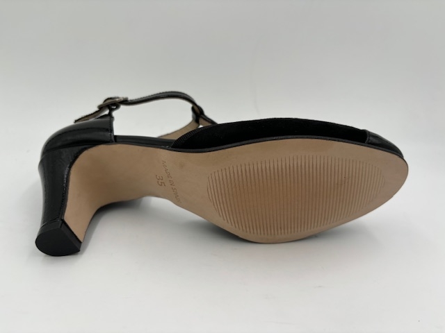 Talon. Dessus cuir vernis et nubuck. Doublure cuir. Première cuir. Fermeture avec boucle sur le côté. Semelle élastomère. S'entretient avec un chiffon humide pour le cuir vernis. Se lave et se fait sécher à l'ombre pour le nubuck.