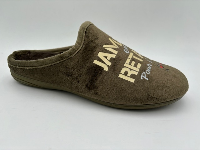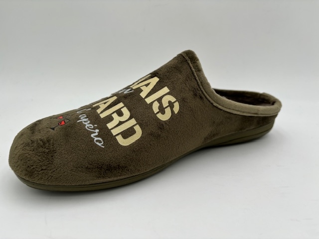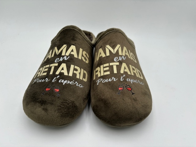 Pantouffles. Dessus textile. Doublure textile. Première textile. Semelle élastomère. Se lave et se fait sécher à l'ombre.
