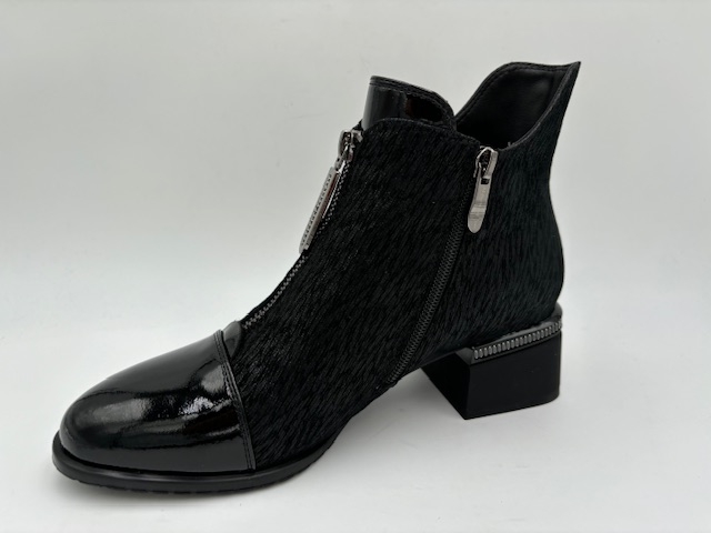 Bottines. Dessus cuir vernis et nubuck. Doublure textile. Première textile. Fermeture éclaire sur le côté. Semelle élastomère. S'entretient avec un chiffon humide pour le cuir vernis. Se lave et se fait sécher à l'ombre pour le nubuck.