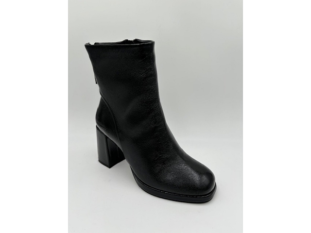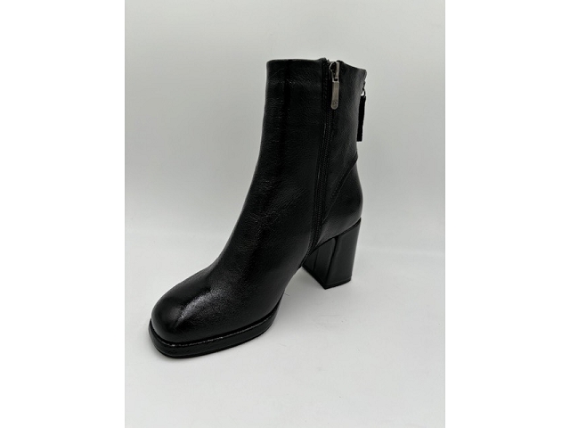 Bottines. Dessus cuir vernis. Doublure textile et synthétique. Première cuir. Fermeture éclaire sur le côté et à l'arrière. Elastique à l'arrière. Semelle élastomère. S'entretient avec un chiffon humide.