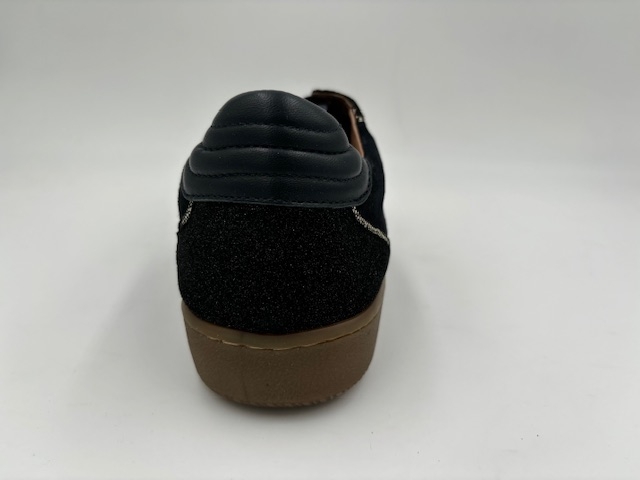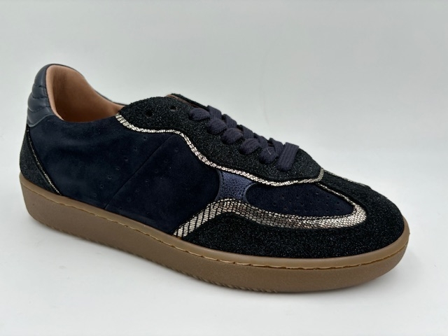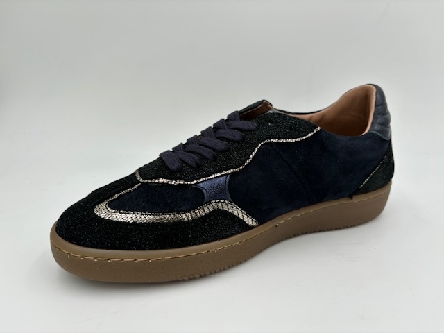 Lacet. Dessus cuir, nubuck et glitter. Doublure cuir. Première cuir. Semelle élastomère. Se cire pour le cuir. Se lave et se fait sécher à l'ombre pour le nubuck.