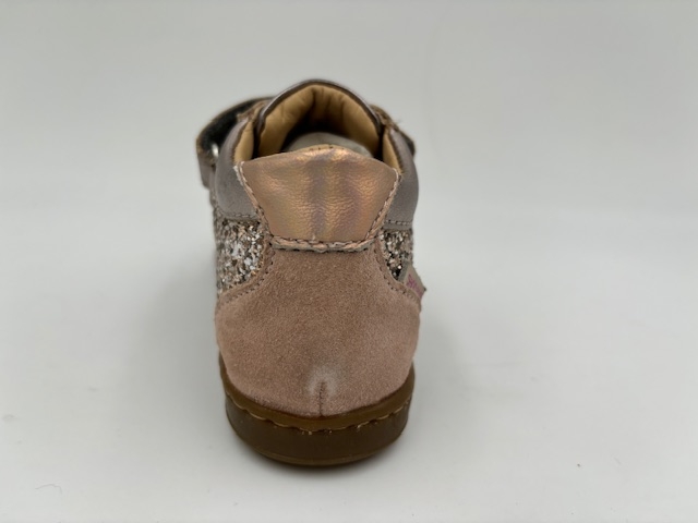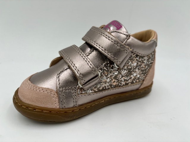 Scratch montant. Dessus cuir, nubuck et glitter. Doublure cuir. Première cuir. Bon contrefort arrière. Voute plantaire. Fermeture avec scratchs sur le coup de pied.  Semelle élastomère. Se cire pour le cuir. Se lave et se fait sécher à l'ombre pour le nubuck.