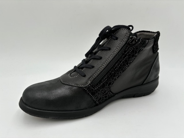 Haut lacet. Dessus cuir et cuir vernis. Doublure textile. Première textile. Fermeture éclaire sur les côtés. Semelle élastomère. Se cire pour le cuir. Se'entretient avec un chiffon humide pour le cuir vernis.